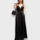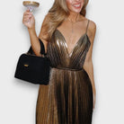 Aurora – Golden Pleated Dress with Deep Neckline